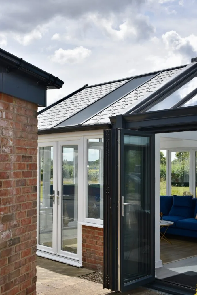 Aluminium Anthracite grey Bi-Folding doors went in on two sides giving the option of totally opening up the space in spring and summer, with toughened glass A plus rated double glazed sealed units.